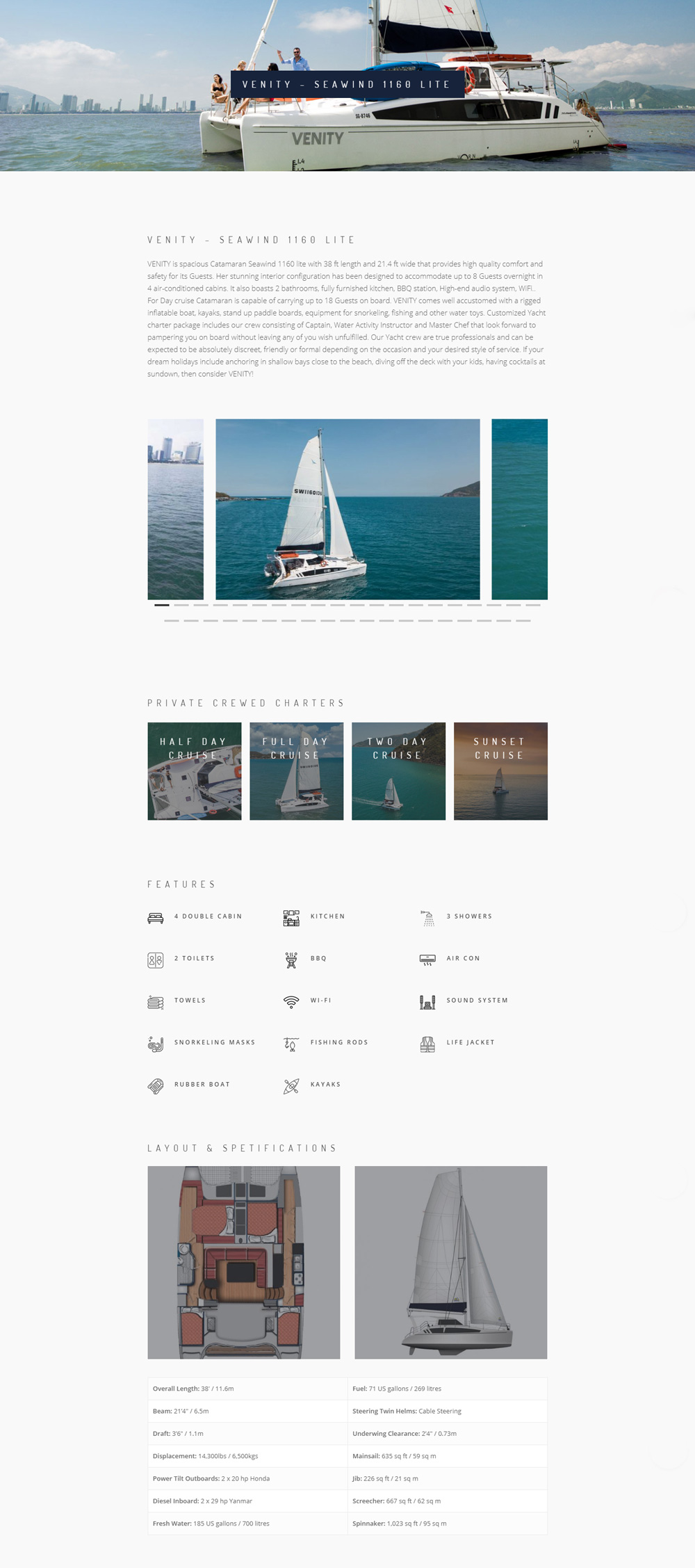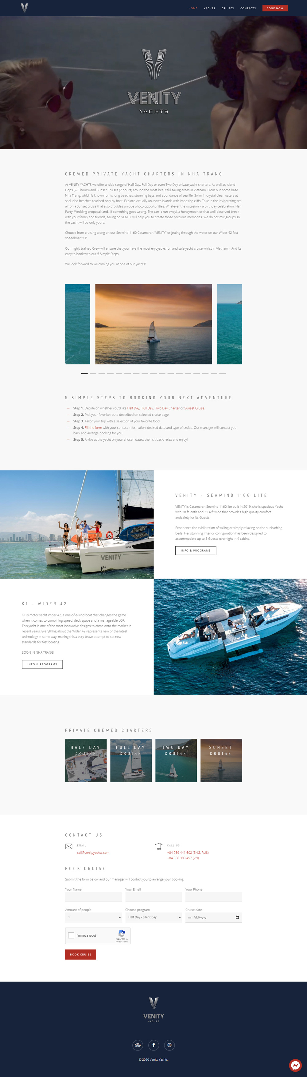 In my opinion, Venity's businesses provide the best service for high-end travelers in Nha Trang, Vietnam. Their "VENITY YACHT" is a recent project purely focusing on private luxury cruises on a modern sailing catamaran. I've been working with the following customer for many years, so I've developed their new website as well. The goal was to make something similar to Venity Villa website, which I've done before, but to make it better, a bit more complex, and with a new color palette.